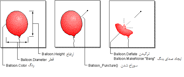 بعنوان مثال بادکنک های کودکان دارای خصوصیات، متدها و رویدادها هستند. خصصویات ظاهری یک بادکنک شامل ویژگی هایی مانند ارتفاع، قطر و رنگ آن می باشد و همچنین خصوصیات وضعیت یک بادکنک مانند باکنک بادشده یا بادکنک خالی از باد می باشد یا ویژگی هایی که ظاهری نیستند مانند سن یک بادکنک.به صورت کلی تمامی بادکنک ها این ویژگی ها رو دارند که در هر کدام متفاوت می باشد.