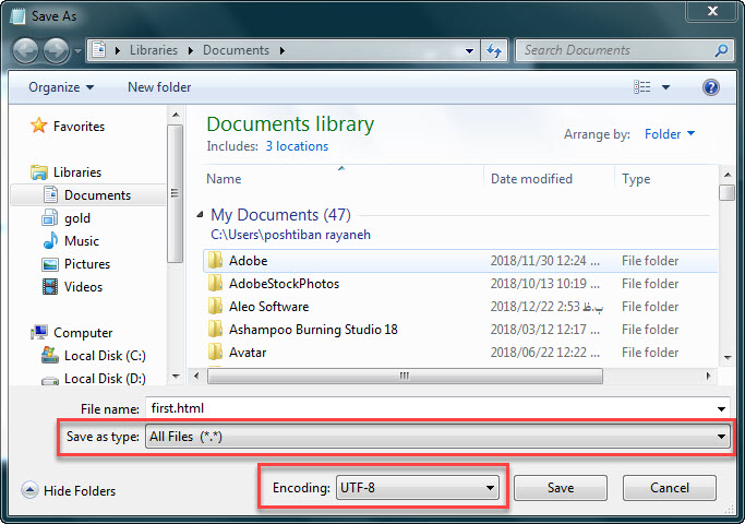 در مثال ما ، فایل به عنوان first.html ذخیره می شود