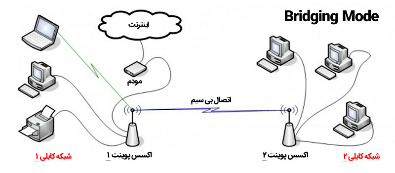 با اکسس پوینت می توانید شبکه بی سیم را به شبکه سیمی متصل کنید.این حالت برای ارتباط دو یا چند اکسس پوینت، به جهت اتصال چندین شبکه کابلی به یکدیگر استفاده میشود. برای این کار، ابتدا از طریق کابل LAN، هر کدام از شبکهها را به یک اکسس پوینت متصل مینماییم، سپس اکسس پوینت ها را در مد Bridg قرار داده تا همدیگر را شناسایی کرده و مرتبط شوند.