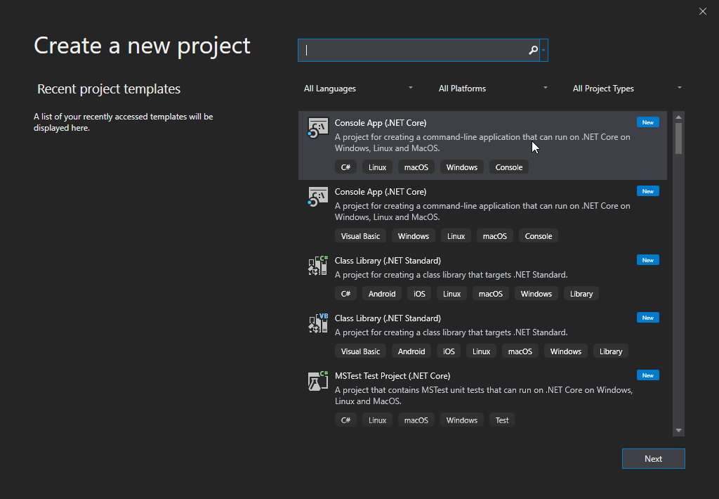 "Console App (.NET Core)" را از لیست انتخاب کنید و روی دکمه Next کلیک کنید: