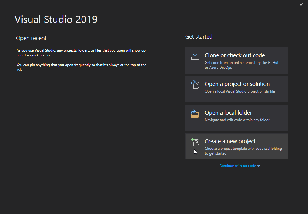 در پنجره شروع، Create a new project را انتخاب کنید:
